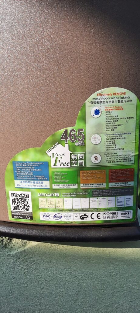 MedAir 601: Reduced cigarette smoke particles from sizes 0.3 µm to 2.5 µm (PM2.5) present in the ambient air of the consultation room by over 70% within 15 minutes and 90% within 30 minutes.